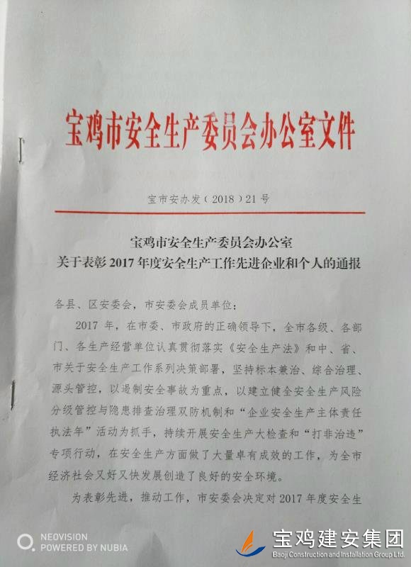近期,寶雞市安委會對2017年度安全生產先進單位進行了通報,我單位在考核中以優異的成績獲得了此項殊榮。當然,取得這樣的成績,離不開各級領導的正確決策和基層單位的艱辛付出,公司安委會在此表示感謝。 2017年,公司始終圍繞在國家的大政方針框架下,積極展開以《安全生產法》及相關規范標準為核心的安全工作,堅持標本兼治、綜合治理、源頭管控,以遏制安全事故為重點,建立健全安全生產風險分級管控與隱患排查治理雙重機制,持續開展安全生產專項檢查,杜絕了惡性事故的發生。在安全生產標準化建設中,公司始終以“科技創新、合理投入、擇善而從”為出發點進行部署管理,通過系統管理及一系列舉措,使公司安全管理走在本土行業前列,且在多次檢查驗收中,獲得省、市級領導的點贊。 九牛一毫莫自夸 驕傲自滿必翻車,成績只代表過去,2018年,我們要完善不足,戒驕戒躁,砥礪前行。 寶雞建安集團股份有限公司安委會 2018年4月25日